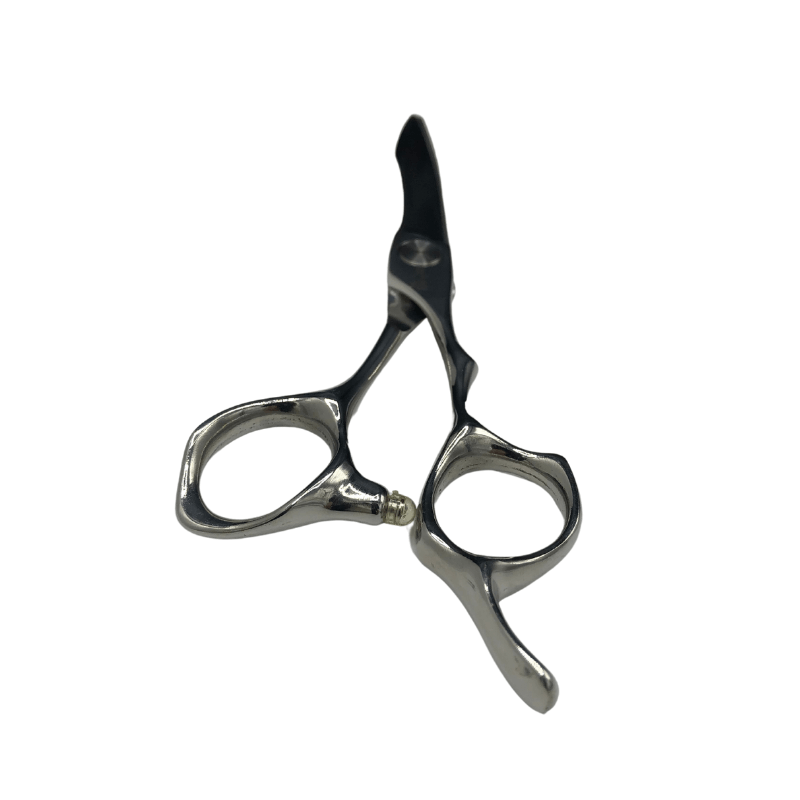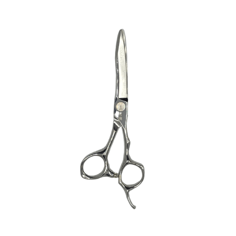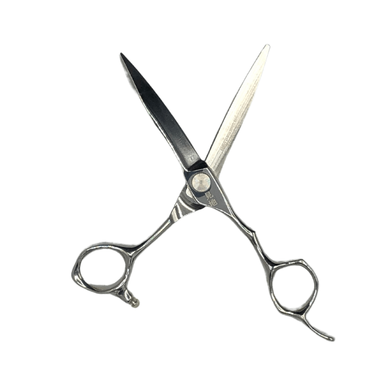 Kenchi Blade Ninjato hairdressing and barbering scissor. Japanese 440c forged steel blade with a 3D convex edge. Hand crafted with an ergonomic design. Fixed finger rest with a grooved offset handle for comfort. Adjustable ultra tension screw system. Premium rubber stopper.