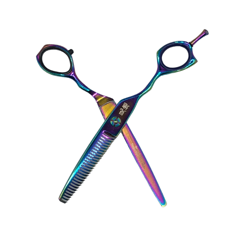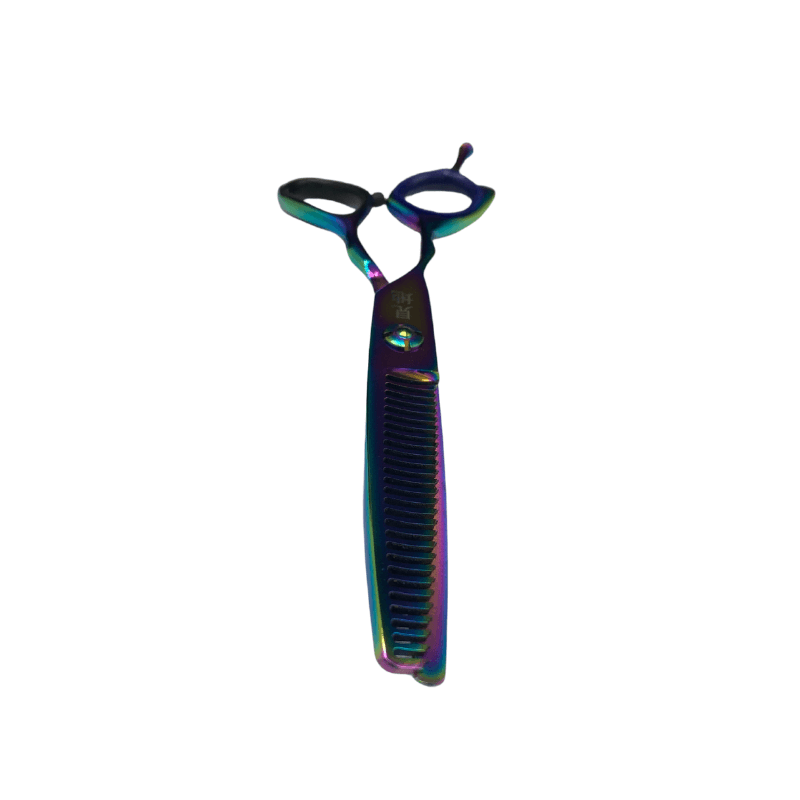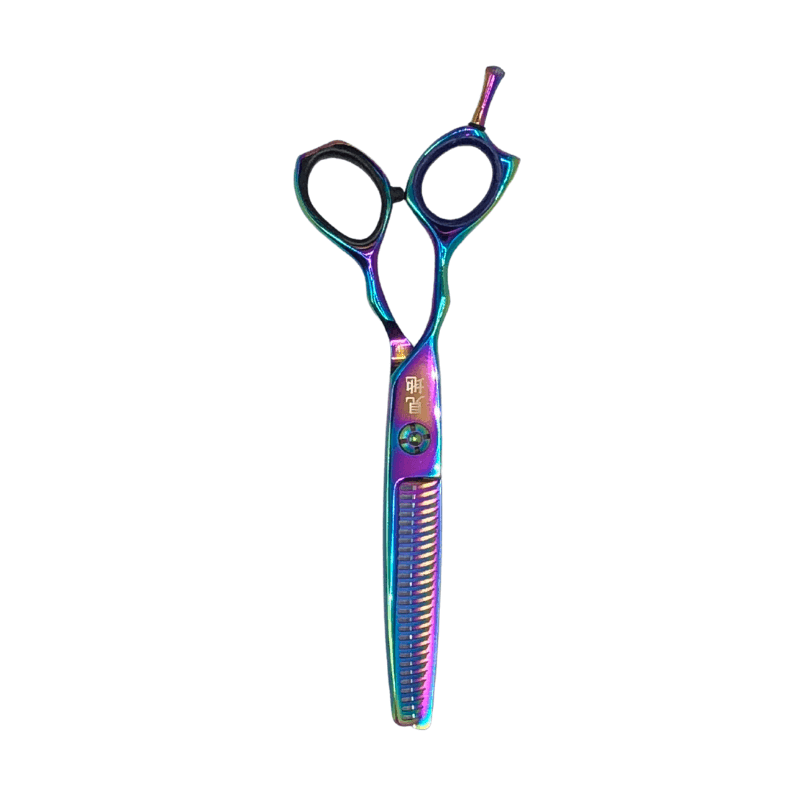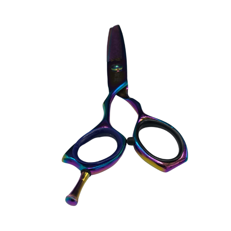 Kenchi Blade Ranjit hairdressing and barbering thinning scissor. Japanese 440c forged steel blade with a 3D convex edge. Hand crafted with a beautiful rainbow colours design pattern. Removable finger rest with a grooved offset handle for comfort. Adjustable ultra tension screw system. Premium rubber stopper.