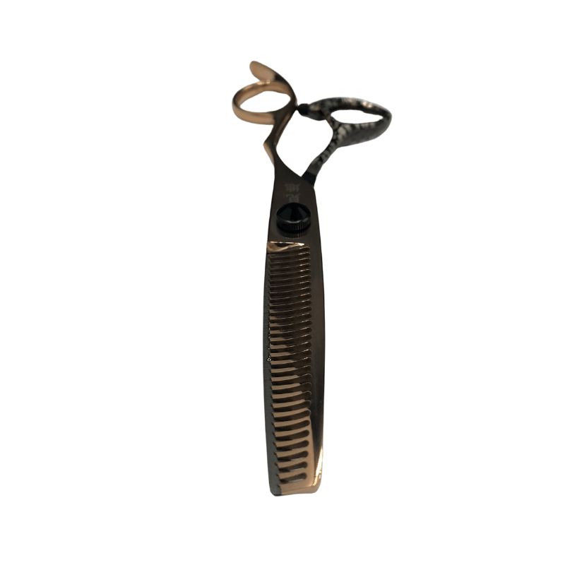 Kenchi Blade Hyo hairdressing and barbering thinning scissor. Japanese 440c forged steel blade with a 3D convex edge. Hand crafted with a black titanium leopard print pattern and ergonomic design. Fixed finger rest with a grooved offset handle for comfort. Adjustable black titanium ultra tension screw system. Premium rubber stopper.