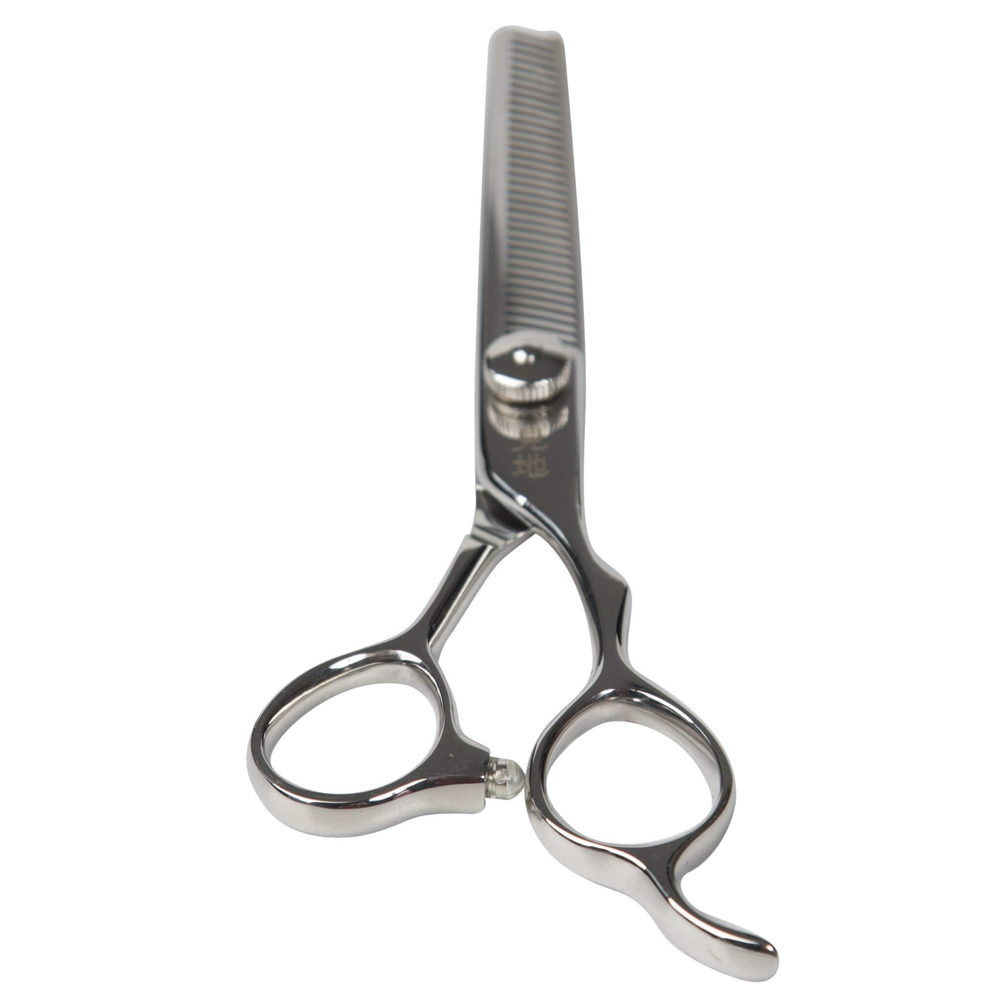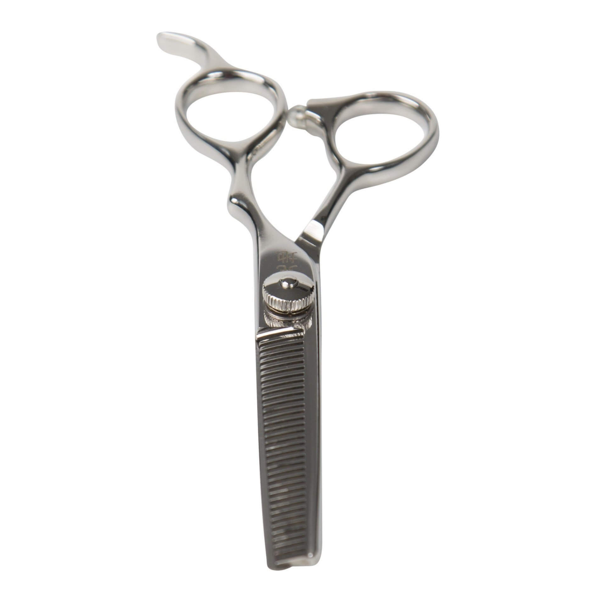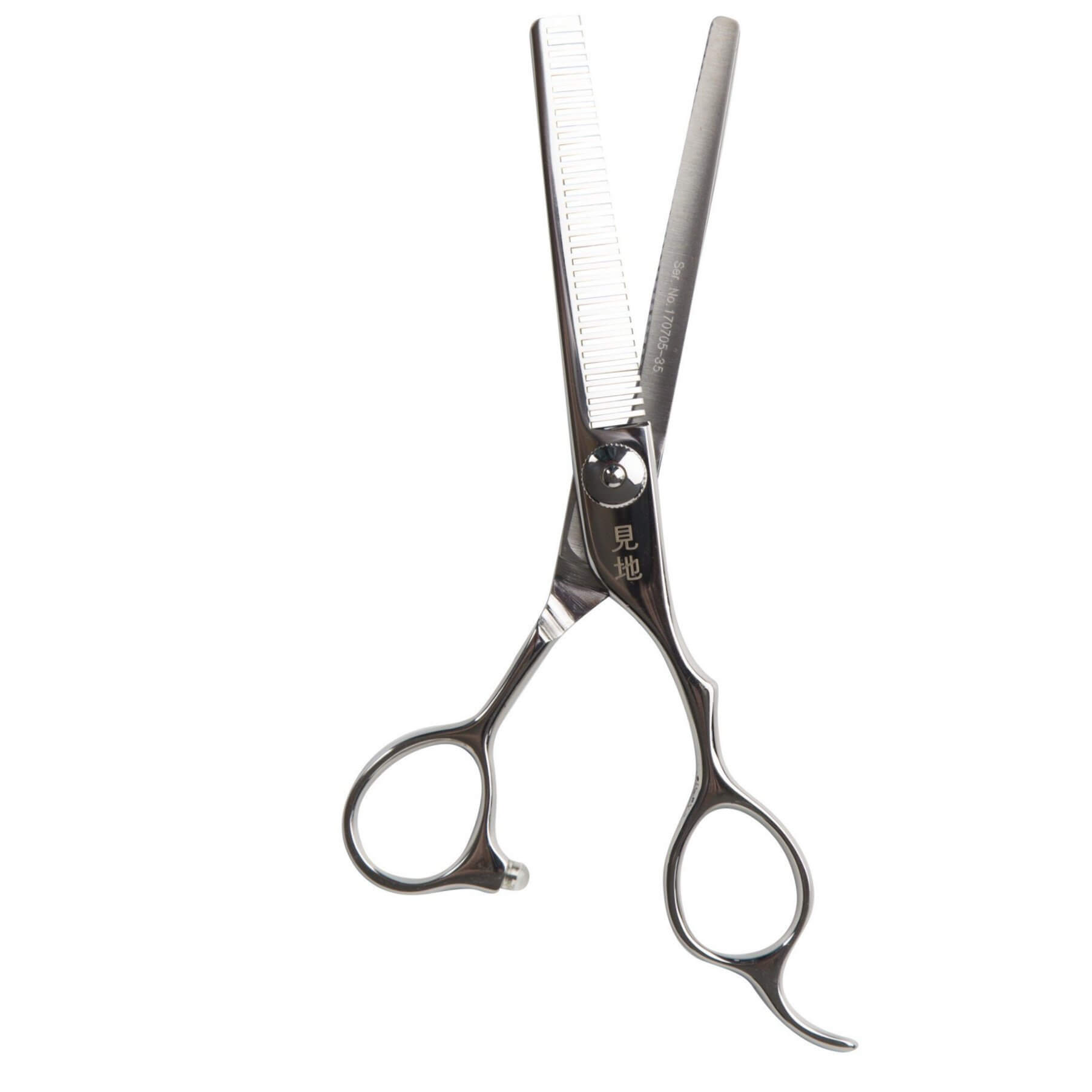 Kenchi Blade all around traditional thinning scissor for hairdressing or barbering, made in Japanese 440c steel with a quality tension screw system. Offset fixed finger rest. Japanese 3D Convex.
