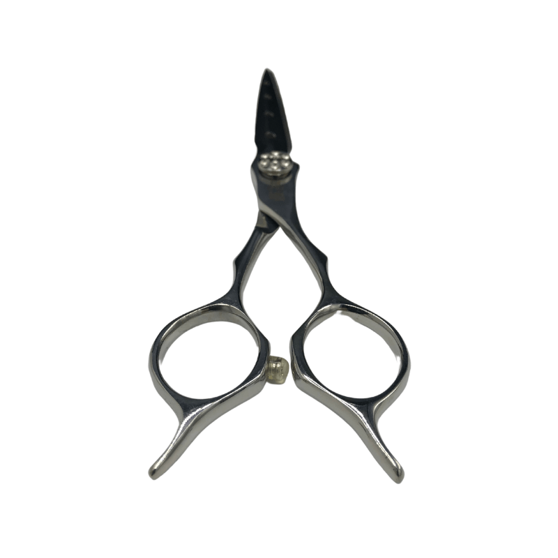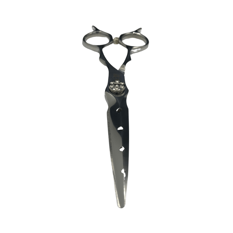 Kenchi Blade Zarashi hairdressing and barbering scissor. Japanese 440c forged steel blade with a 3D convex edge. Hand crafted with pin holes to make the blade lightweight. Fixed finger rest with a ergonomic offset handle for comfort and design . Adjustable ultra tension screw system. Premium rubber stopper.